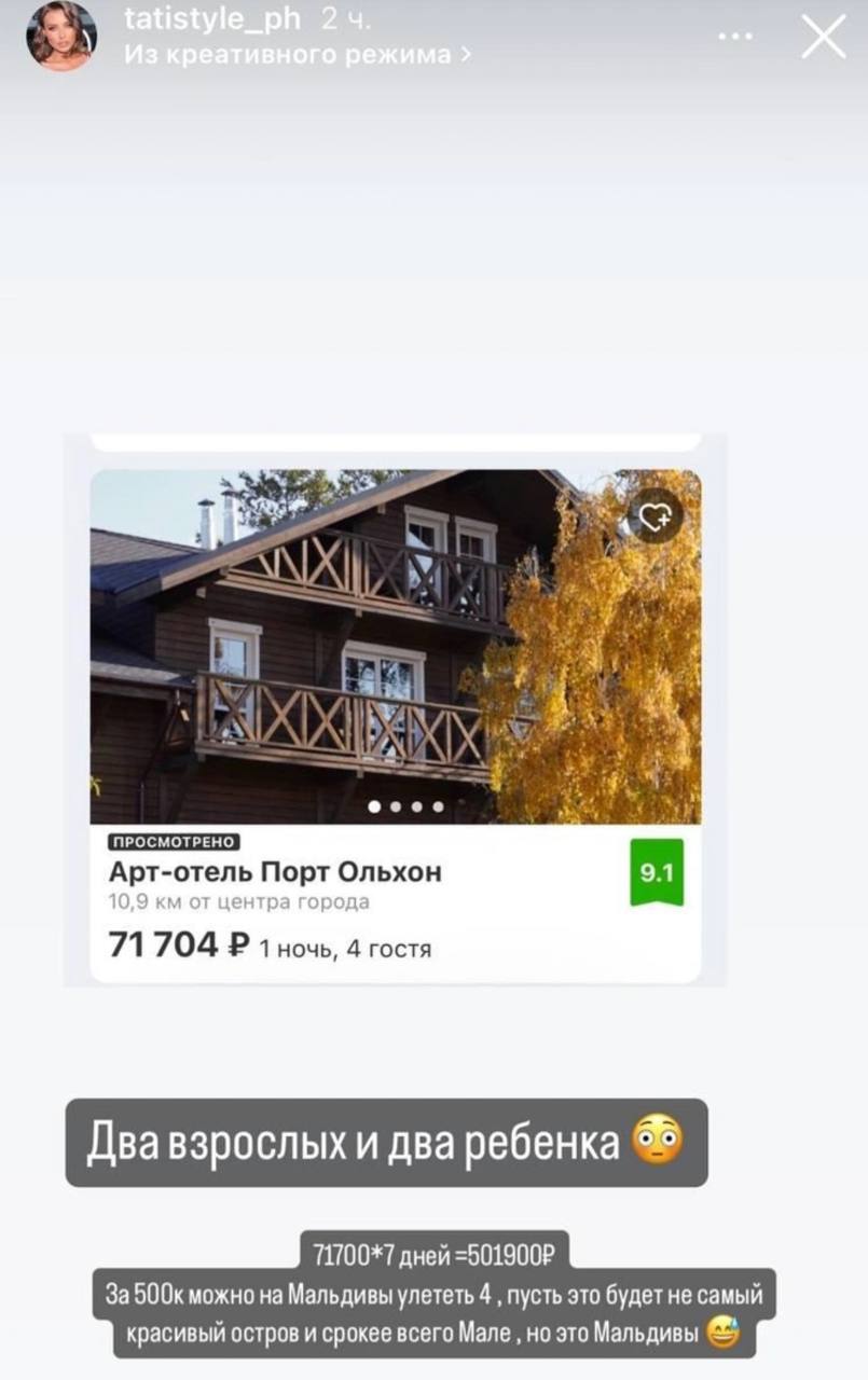 Блогер изучила цены на проживание в гостиницах Ольхона. Так, стоимость ночи в одном из крупных отелей для семьи с двумя детьми обойдется в 72 тысячи рублей. А неделя отдыха на острове будет стоить полмиллиона рублей. Девушка заметила, что за эти деньги можно отдохнуть на Мальдивах. Такой же срок в отеле за рубежом будет стоить 364 тысячи рублей.