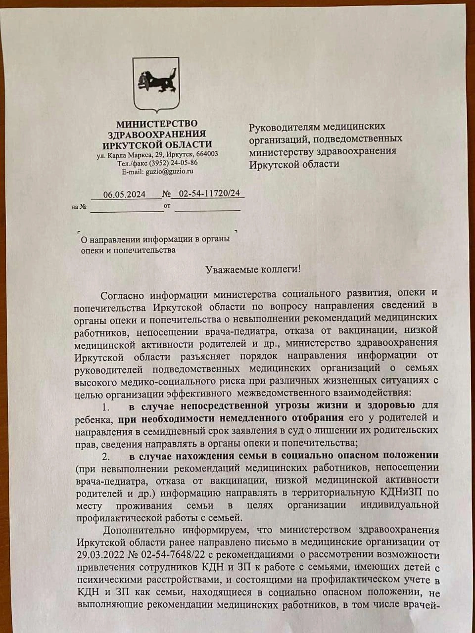 Аппарат губернатора Иркутской области, а также министерство здравоохранения пояснили, что «Посыл письма в том, что медицинские организации имеют возможность информировать Министерство здравоохранения о семьях, которые подвержены риску социально опасного положения, а также о семьях, в которых родители пренебрегали здоровьем детей».