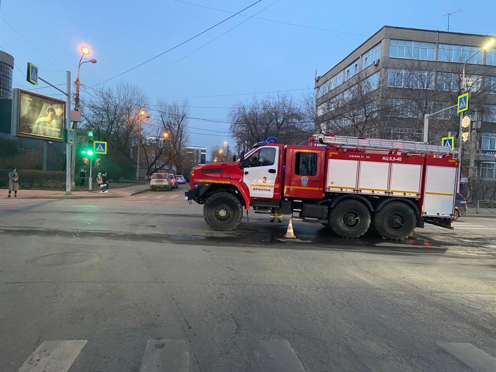 В Иркутске на улице Декабрьских событий произошло столкновение рейсового автобуса и пожарного автомобиля. После столкновения автобус выехал за пешеходное ограждение, сбил дорожный знак и врезался в дом.