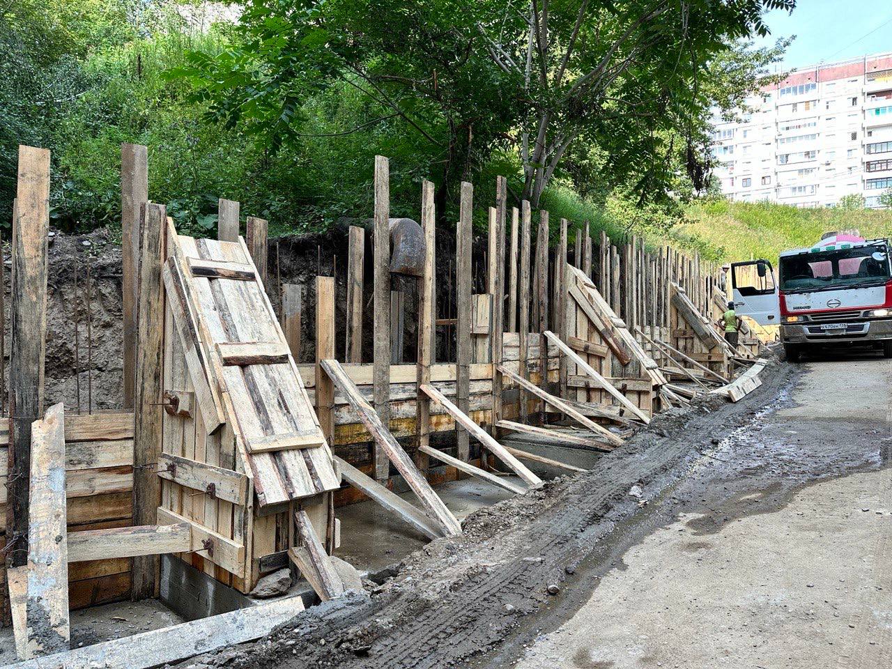 Также спикер Думы проверил ремонт подпорной стенки по адресу Университетский, 92. Стенка была в аварийном состоянии. Людей беспокоит вода, которая с началом работ теперь течет прямо по дороге.