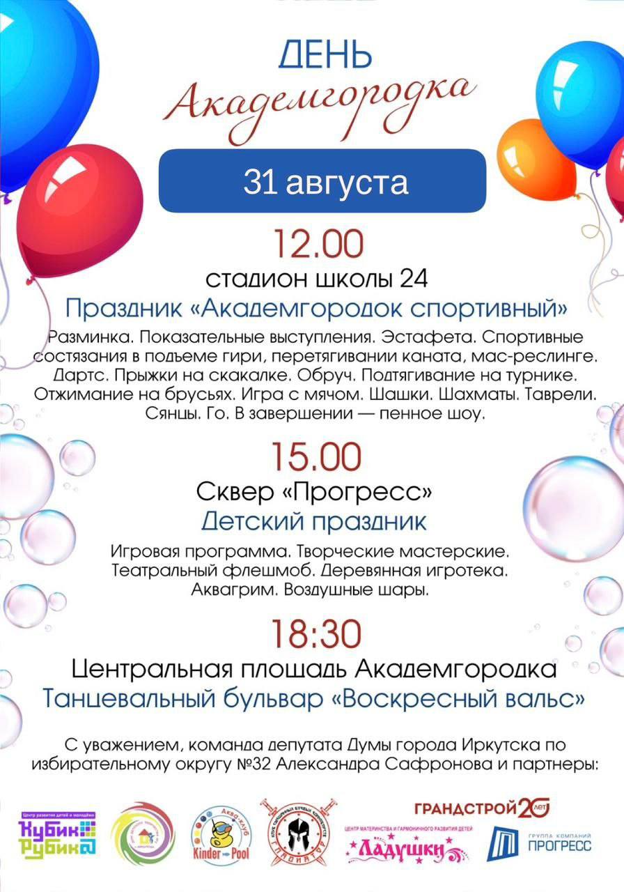 В программе праздника — показательные выступления и спортивные состязания на стадионе школы №24 с пенным шоу по завершении. В 15:00 — детский праздник в сквере «Прогресс» с театральным флешмобом, мастер-классами и творческими мастерскими, а в 18:00 — танцевальный вечер на главной площади Академгородка.