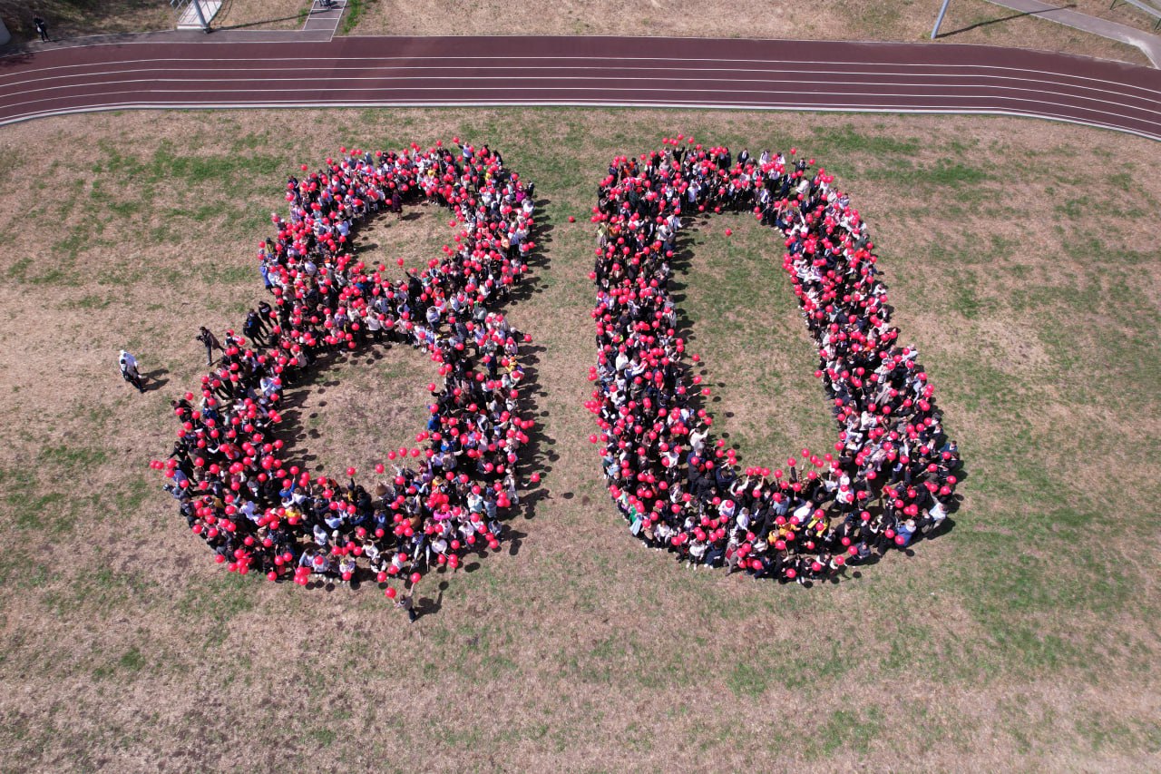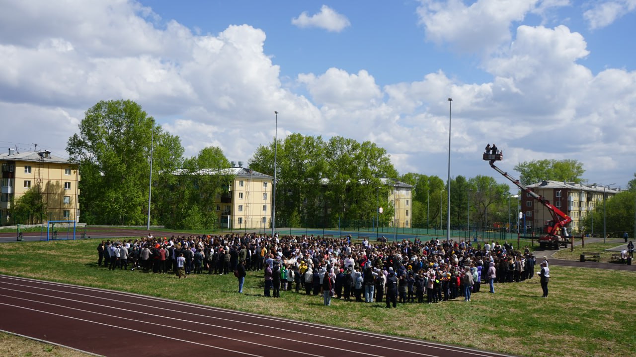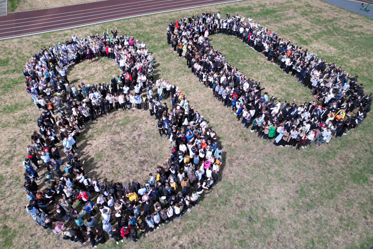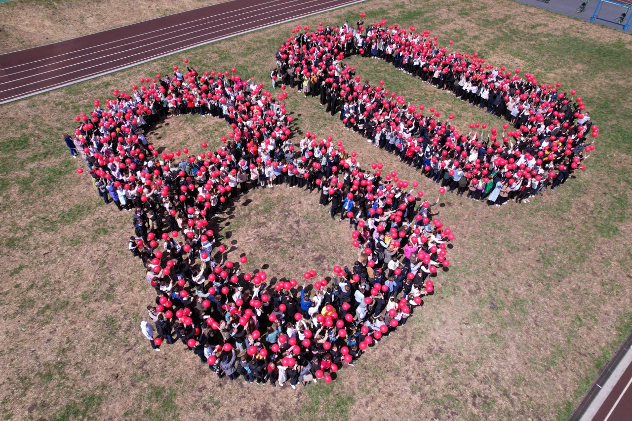 На стадионе школы № 53 ученики образовательных учреждений №№ 38, 53, 69 выстроились в цифру 80. Флешмоб собрал около тысячи человек.