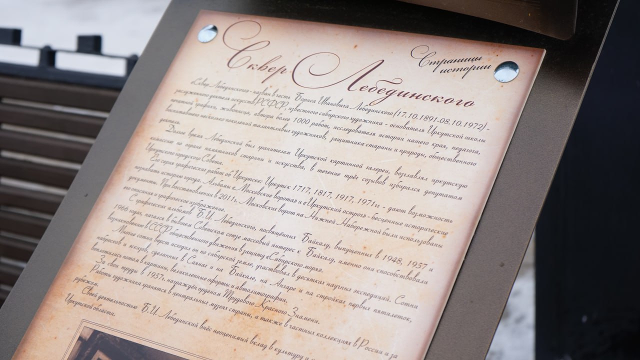 В Иркутске прошла торжественная церемония открытия информационного пюпитра в сквере имени художника, графика и живописца Бориса Лебединского. В ней приняли участие заместитель мэра – председатель комитета по управлению Правобережным округом Елена Торохова, депутат Думы Иркутска по избирательному округу № 19 Сергей Юдин, внук творца Александр Киселев, члены Союза художников России, студенты–художники.