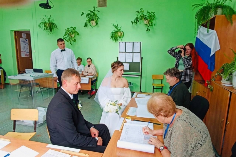 В Черемхово молодожены Андрей и Вера Главинские приехали на избирательные участки прямо из ЗАГСа — в свадебных нарядах.