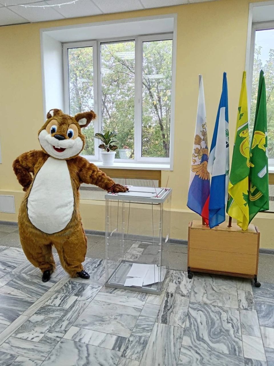 На УИК №1794 в Лесогорске Чунского района голосовала белка. Избирателя в плюшевом костюме сняли на видео очевидцы и опубликовали кадры во «ВКонтакте».
