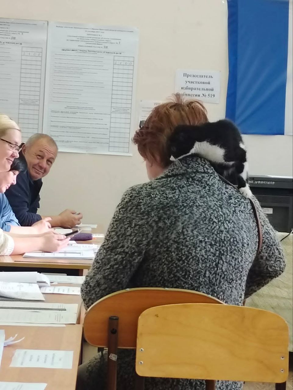 Не плюшевый, а абсолютно настоящий живой кот пришел на избирательный участок 519 в Иркутске — на плечах у своей хозяйки. Женщина взяла с собой питомца за компанию.