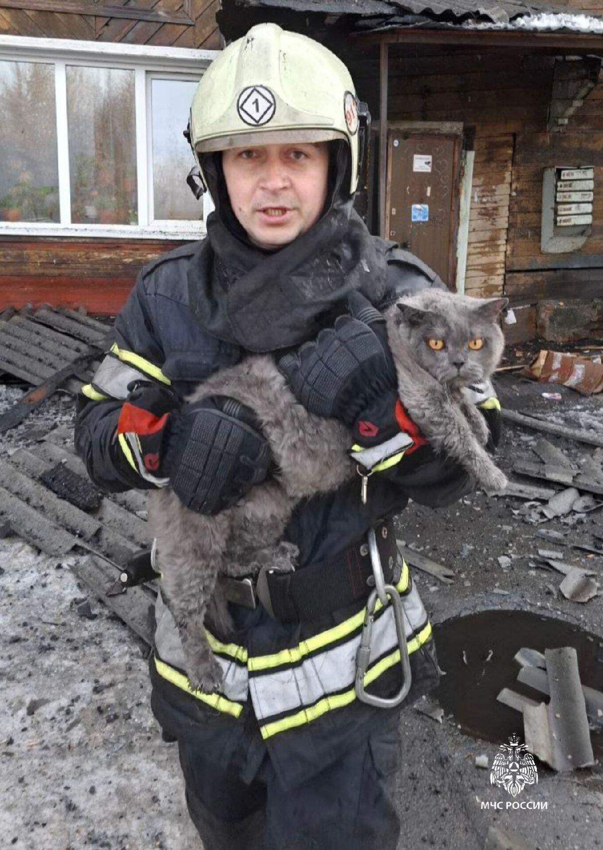 Иркутские пожарные спасли из горящего рушащегося дома двух котов. Одного из них пришлось буквально отдирать
